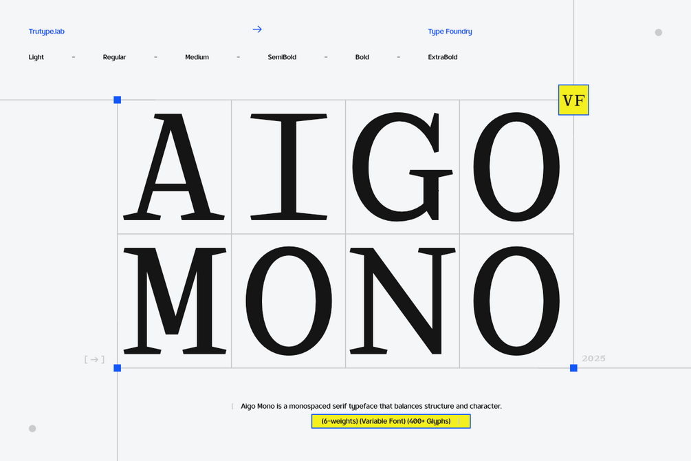 The serif details introduce a subtle sense of character and warmth, softening the rigid nature of monospace typography without compromising legibility. Carefully balanced proportions and multiple weights allow Aigo Mono to perform across editorial layouts, interfaces, and experimental compositions.