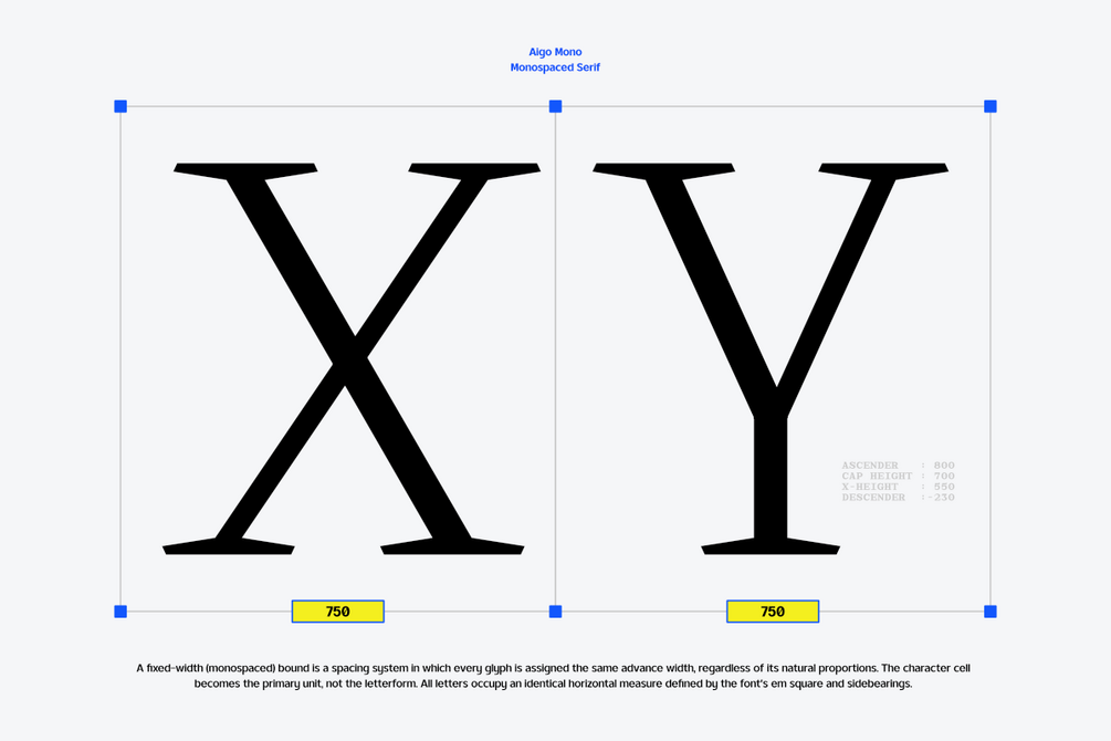 Aigo Mono is a monospace serif typeface built around structure, rhythm, and typographic discipline. With equal-width letterforms, it establishes a consistent grid that brings clarity and order to complex layouts, making it especially effective in systems-driven design.