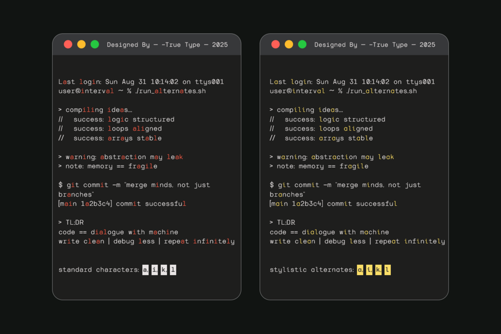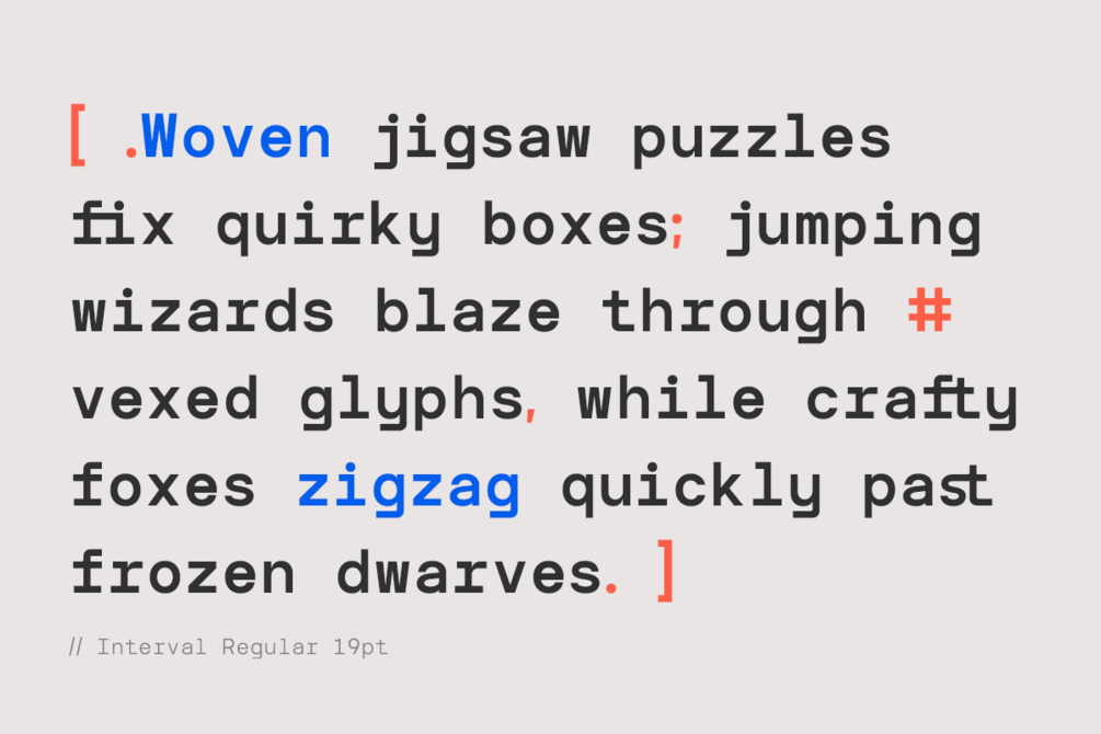 The result is TRT Interval — a modern monospace sans serif designed for clarity, rhythm, and versatility. Whether used in branding, editorial layouts, user interfaces, or code, Interval delivers a strong typographic voice that’s both functional and refined.