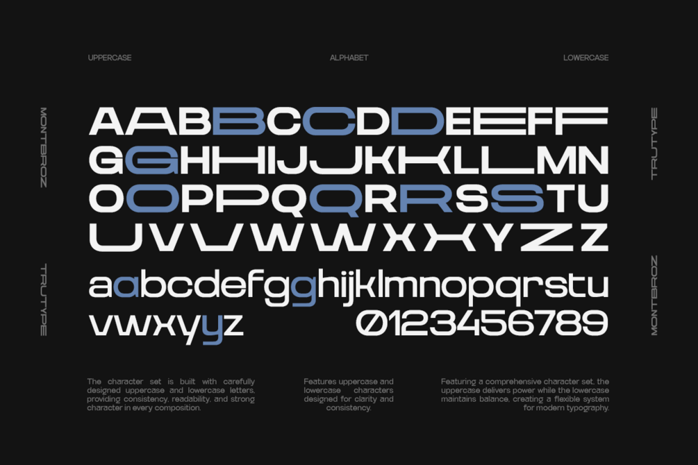 Inspired by modern editorial layouts and futuristic design language, TRT Mont Broz balances precision and softness to create letterforms that feel solid, modern, and highly legible. Its bold structure and consistent rhythm make it ideal for magazine covers, branding identities, posters, packaging, and visual statements that demand attention.