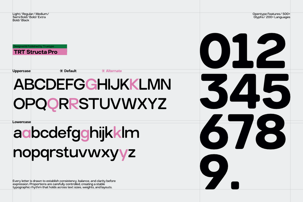 With multiple weights and a variable font option, TRT Structa Pro adapts easily to diverse design systems—from expressive headlines to clean UI text. The typeface maintains consistency and legibility while adding a subtle personality that feels modern, human, and refined.