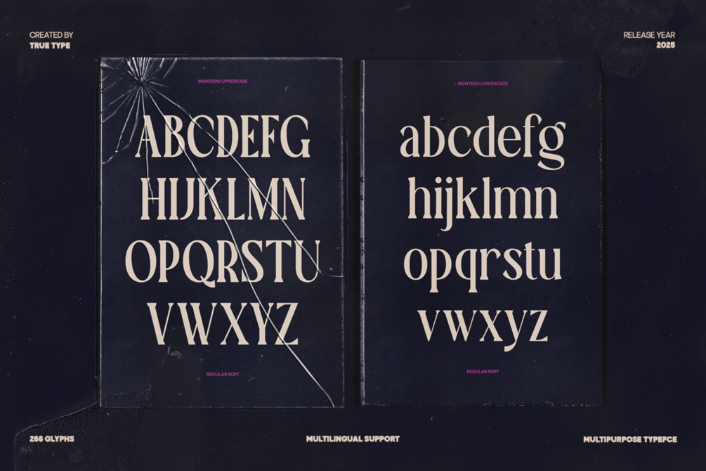 With its tall letterforms, sharp serifs, and elegant contrast, TT Montero is perfect for use in headlines, fashion campaigns, packaging, and typographic quotes. Its condensed shape allows more content to fit in limited space without compromising readability — making it especially useful for magazine layouts, logo lockups, and digital platforms.
